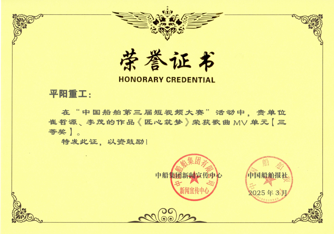 《平陽通訊》榮獲船舶新聞“優(yōu)秀企業(yè)報(bào)刊”稱號(hào);《培養(yǎng)一支知識(shí)型、技術(shù)型、創(chuàng)新型隊(duì)伍——記中國船舶平陽重工技能人才成長之路》榮獲文字類二等獎(jiǎng)、《用“智慧大腦”系統(tǒng)開采礦山》《當(dāng)平陽青年遇上傳統(tǒng)文化,匠心撞個(gè)滿懷》榮獲文字類三等獎(jiǎng);《匠心筑夢(mèng)》榮獲第三屆短視頻大賽三等獎(jiǎng)。